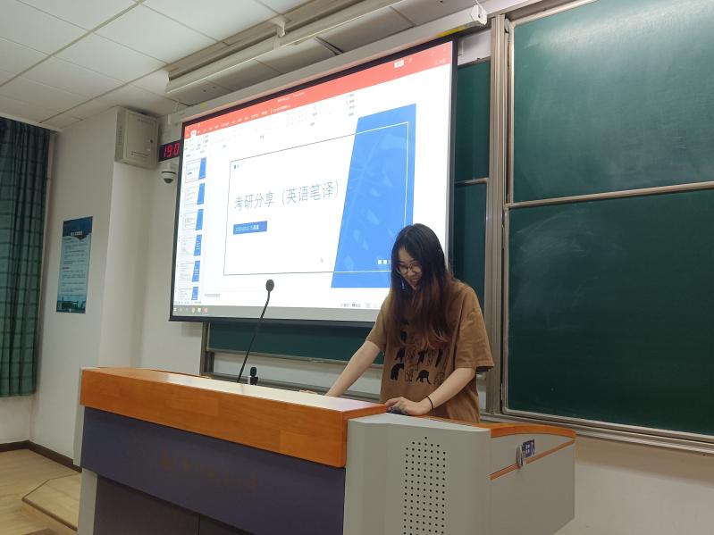 活动伊始,大三年级中心组成员马晨馨介绍了两位同学被录取的院校情况。之后,考取华东师范大学英语笔译专业的王晨露分享了MTI备考经验。她详细介绍了考试科目、备考规划、各科重点及择校技巧等信息,并结合个人心得提供了具体建议,帮助同学们明晰了学习目标和学习方向。