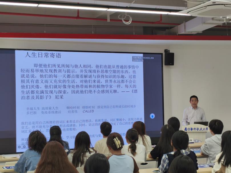 2024年10月17日晚,成人漫画 本学期第一期学业领航讲座在天目湖校区“一站式”空间顺利举行。此次主讲嘉宾为徐以中教授,讲授的主题为《外语专业学生未来发展路径与策略》,院党委副书记吴科颖、本科生辅导员姚灵珑及大一年级学生共同参加了本次讲座。