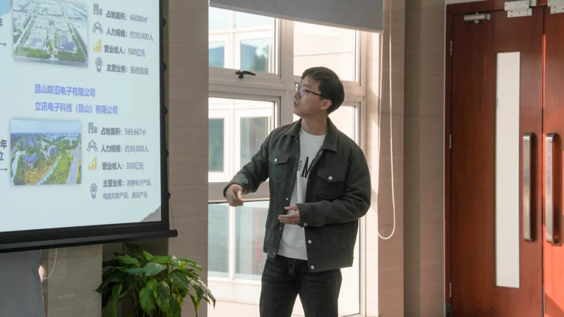 活动伊始,师生们前往立讯精密锦溪园区参观。刘颖为大家详细介绍了立讯精密及锦溪园区的基本概况。立讯精密作为全球电子连接器及精密制造领域的领军企业,专注于向客户提供卓越的产品和服务。公司在电子连接器和高端装备制造领域拥有雄厚的技术实力,为消费电子、汽车及企业通信产品提供从关键零部件、模块到系统组装的全方位智能制造解决方案。
