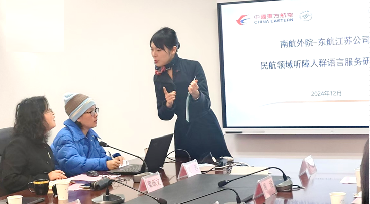 12月19日,成人漫画 与东航江苏公司联合举办民航领域听障人群语言服务研究交流会。东航江苏公司培训中心老师文洪、张玥、东航凌燕组长贺炫及客舱乘务各分部代表与成人漫画 院长徐以中、党委副书记吴科颖、团委书记李萍、英语系主任张立新、航空英语研究中心主任王孝存、研究生公共外语教学部教师梁砾文副教授、大学外语教学部许阳博士和部分本科、研究生学生代表参与交流,会议由王孝存主持。