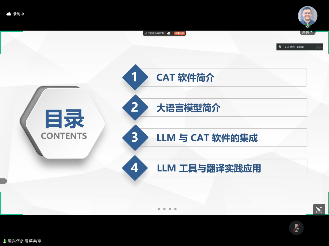 在数字化转型加速演进的背景下,人工智能技术的突破性发展正推动各领域技术革新,AI翻译软件也随之不断涌现。为优化学科人才培养路径,成人漫画 MTI教育中心于2025年3月10日特邀翻译技术专家周兴华老师作了题为“大语言模型与翻译实践——工具与应用”的讲座。本次讲座由鲍德旺教授主持,成人漫画 2024级全体MTI硕士研究生参加。