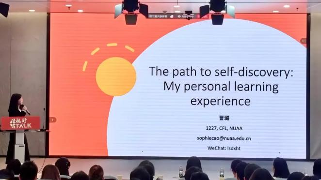 活动开始,学院青年教师曹璐讲述了她的留学经历对于她成长发展的重要作用,鼓励同学们把握国际交流机会,从更加广阔的视角规划学习生涯。谈到对于英语专业未来发展的看法时,她说:“英语专业在AI时代面临新的发展机遇,无论是‘语言+AI’的跨学科领域,‘教育+语言’的学习创新,亦或是‘全球化+跨文化’交流的结合,都为我们的英语专业发展提供了更多可能。”