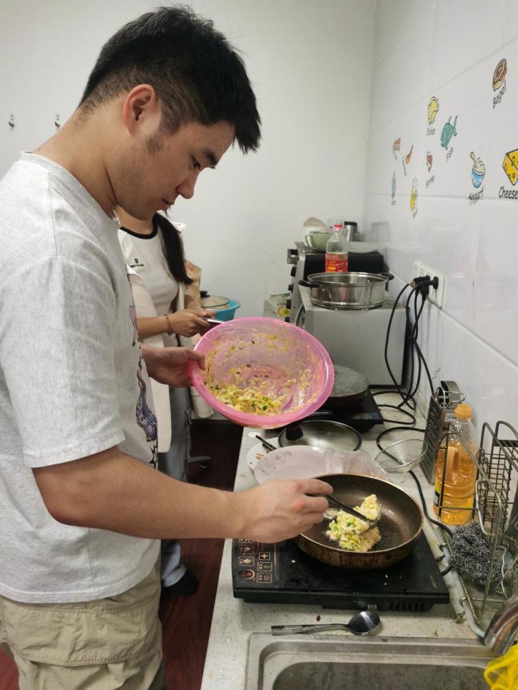 中午时分,外教北村忠吉老师在“快乐厨房”带领同学们制作了日本传统美食大阪烧与甜点松饼。在过程中,他耐心地讲解制作步骤,不时用幽默的语言调动气氛,同学们一边认真聆听,一边协助北村制作美食。